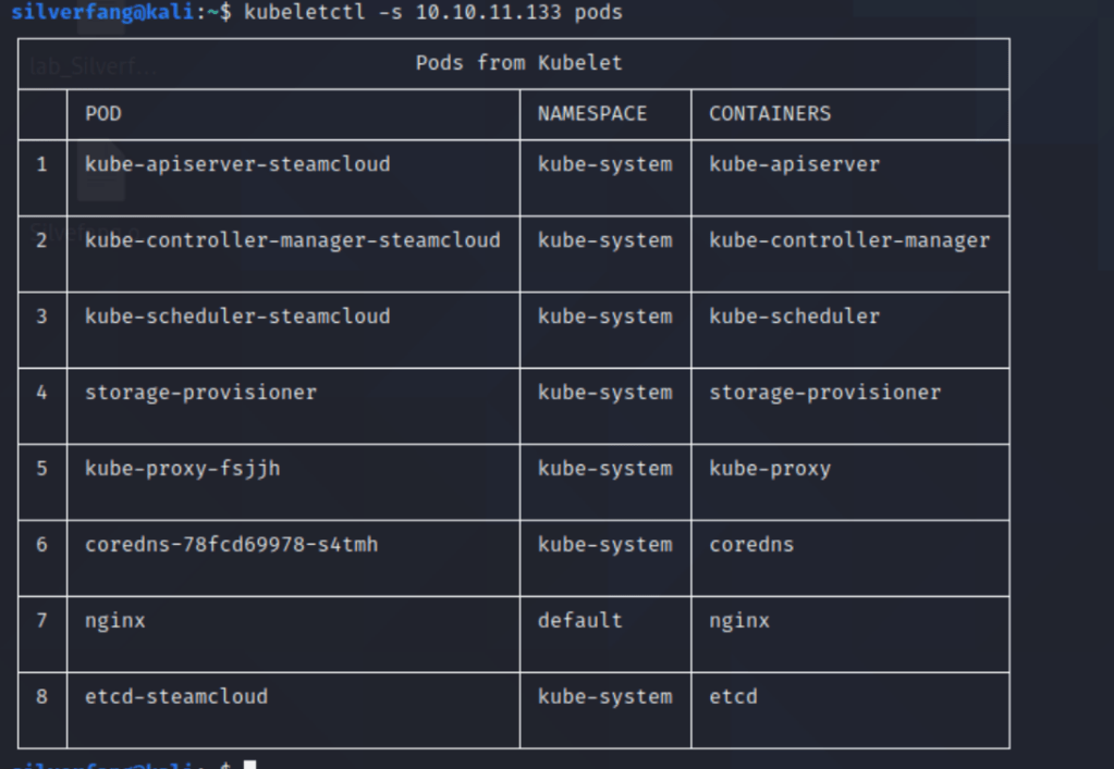 So we got ports 22, 2379, 8443, 10249, 10250, and 10256 open. Taking a look at the details, ports 8443 and 10256 both reference kubernetes. Using some Google-Fu, I found a rather helpful article on Kubernetes Attack Surface by Optiv. It looks like port 8443 is often the default port for K8s Minikube API server and 10250 is the port for the kubelet api. Unfortunately, the former requires some level of authentication, but the latter does not and contains a lot of info about the pods in the cluster. Running a quick curl command was enough to get it to pour out a bunch of data: